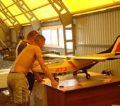 Появилась интрига. Реальный конкурент Кондрашову. Чуствовалось что он сможет его достать. И в третьем туре, когда Кондрашов смазал две фигуры (снижение 360градусов полетел вообще не понял сам куда, и сильно смазал посадку) у Багаутова появился реальный шанс выйти вперед. Но и он не смог отлетать чисто, смазал конвеер и кажется посадка было неидельной. В результате проиграл совсем немножко и самое главное показал что и военные самолеты вполне могут конкурировать с пилотажками. Хотя на послидних действительно легче побеждать (мое субьективное мнение). Соревнования прошли в спокойной непринужденной обстановке. Небольшое количество участников позволило провести соревнования неспеша. В первый день стартов было очень жарко. Как и обещали синоптики было все +35. Решили что сначала лучше провести стенд и получилось что в самую жару мы были в ангаре в тени, а свободные участники имели возможность купатся на озере которое находится в ста метрах от ангара. Полеты сначала наметили на 15часов но потом перенесли еще на два часа. Все остались этим довольны потому как в такую жару у многих моторы перегревались. До вечера провели первый тур и половина второго. Ну а в восскресенье, погода сжалилась над нами с утра налетели тучки и было очень комфортно летать. Правда в восскресенье ветер стал дуть практически поперек полосы но все отлетали без проблем и даже господин Плющев, который так этого боялся, совершил прекрасные взлеты и посадки. А вечером в субботу мы организовали пионерский костер, угощали всех ухой, и неплохо попели под гитару. Хорошими песнями нас порадовали Никитин и особенно Ютландов. Берите на заметку. Ну по судейству выскажутся сами участники, но мне показалось что по сравнению с прошлым годом оно стало на порядок лучше, мы учимся.