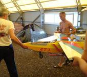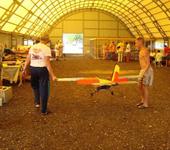 Последние 10 километров грунтовки, и усталому путнику открывается великолепный вид на домики с озером на фоне холмов, покрытых лесом. Тепло, почти штиль. Оно стоило того !!! В ангаре царит легкая суета, участников больше в два раза, новые модели. Первым делом осматриваю поле. В этом году оно значительно лучше. Травка подстрижена ровнее и короче, выкаты более пологие. Заехал прямо в ангар к столу, удобно разгрузился, немного подсобрал самолет и спать. В такой тишине и на свежем воздухе спится особенно крепко. Утром начался стенд. В тонкости судейства я не вдавался, но в целом, судьи были собраннее, вершили суд без особых проволочек. Тем временем к жаре добавился неприятный ветерок. Он конечно не был тем, при котором отменяют соревнования, но рисковать не хотелось. Плотный и вкусный обед на 150 руб никак не добавил нам азарта, и сколотив инициативную группу, выдвинули предложение перенести старты на 17 часов. Народ, в основном, двинул к озеру купаться, а потом еще поспать часок… Кааайфф!!! Буфет, полоса, ангар, озеро, домики - все рядом и все радует глаз.