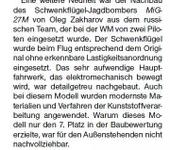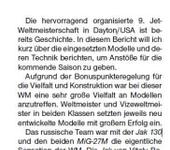 "Русская команда с Як 130 и обоими МиГ-27М была собственно настоящей сенсацией этого чемпионата. Як Виталия Робертуса устанавливает абсолютно новый уровень в деталировке, исполнении и сложности постройки. Здесь речь идёт о «Клоне» в масштабе 1:4, и многие эксперты, при виде качества деталировки, практически потеряли дар речи. Только при последующем детальном рассматривании фотографий, дома на компьютере, находились всё новые и новые мелкие детали, которыми не устаёшь восхищаться. Не надо конечно забывать, что эта модель создана командой, при помощи компьютерных технологий с доступом к оригинальной заводской документации. Виталий был при этом самый большой инициатор идей, менеджер, генеральный конструктор и основной финансист этого уникального произведения авиамодельного искуства! Просто удивительно, как при таких больших размерах модели, с размахом 2,43м, удалось уложиться в 20кг веса. Модель полностью была сделана по сендвичевой технологии с широким применением стекла, угля и кевлара. Второй новинкой был истребитель-бомбардировщик с изменяемой геометрией крыла МиГ-27М от Олега Захарова, эта модель была представлена дважды, думя участниками чемпионата мира из русской команды. Изменение геометрии в полёте, согласно оригиналу, происходило без заметных изменений в центровке. В модели были очень копийно воспроизведены очень сложные в исполнении основные стойки шасси, с электро-механическим приводом. Здесь тоже были применены самые современные материалы и композитные технологии. Почему эта модель заняла только 7 место в статической оценке, для не посвящённых остаётся загадкой."