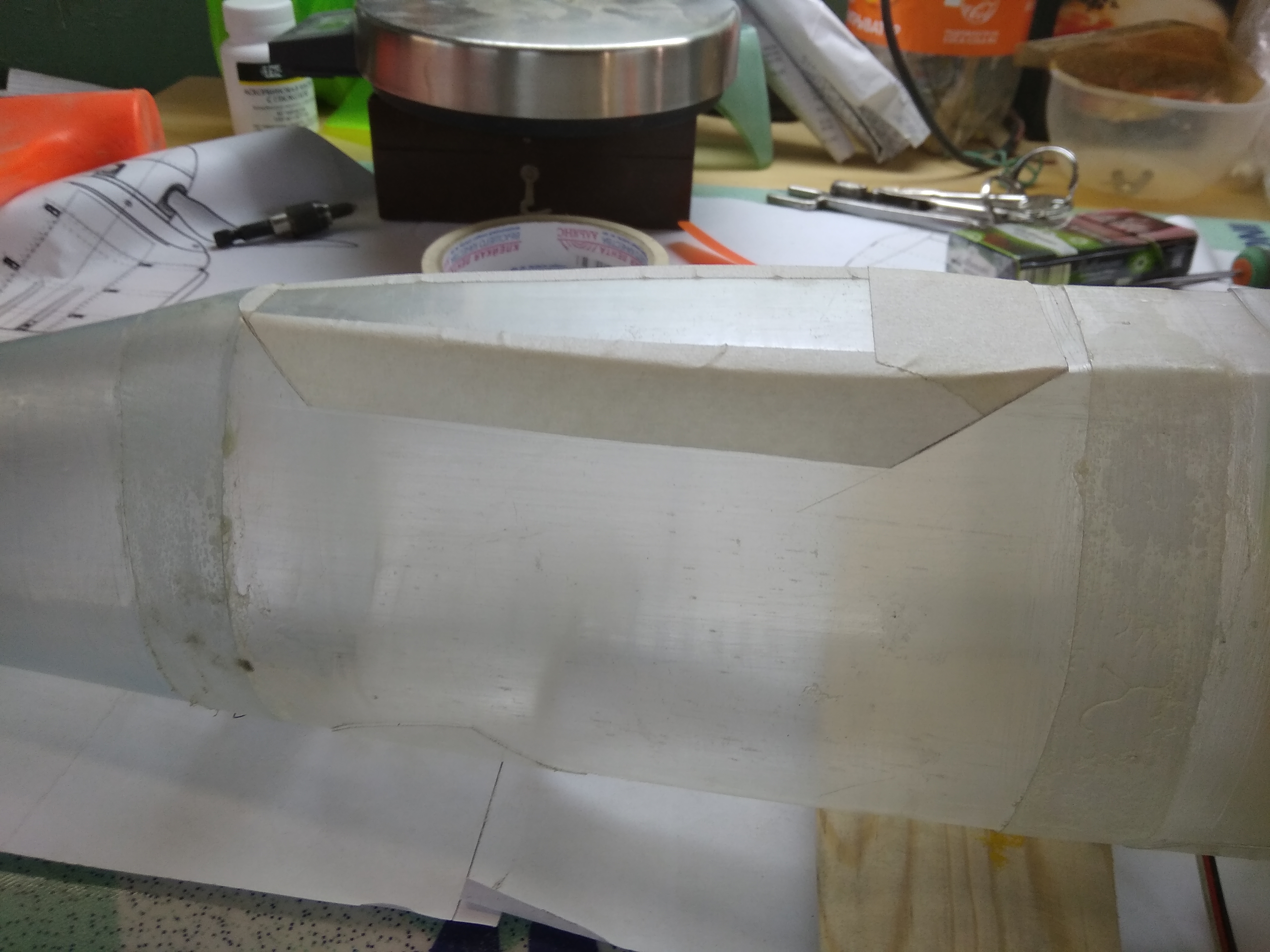 9. Двушку с отрезанным днищем надеваем на болван с носа, должен получиться солидный нахлёст на среднюю секцию.