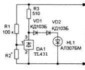 Испытал чуток другую - работает, но R1, R3 - 1КОм, R2 - 2,7КОм , VD(1,2) не ставил. ТЛку (AZ431BZ AG1) вытащил из “погибшего” адаптера на 12В 2А, светодиод - китайская пиранья из фонарика.