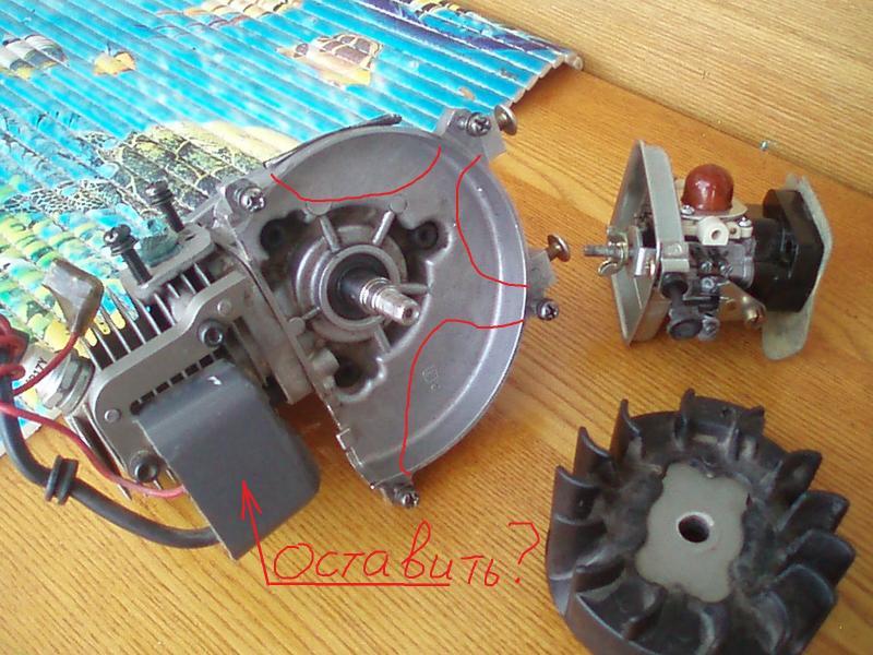 Два варианта - отпилить все лишнее - функцию обдува будет выполнять пропеллер. Или совсем выкинуть, сделать переходник (заказать токарю) и купить электронное зажигание + АКБ к нему небольшое.