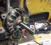 Один имею точно такой, вроде-бы… Маховик снимаем: надеть на вал кусок трубки подходящего диаметра – чтобы немного болталась на валу, а длиной – чтобы при завёрнутой гайке немного болталась вдоль вала. Это чтобы, когда маховик соскочит с посадки-конуса, не разлетелось всё это далеко и не побилось/не покалечило. Держим мотор за крыльчатку невысоко над столом (на всякий случай) и алюминиевым (мягким)/медным/текстолитовым молотком легонько стучим по кончику вала. Гайку закрутить, чтобы вал выступал на 0,5-1,0 мм. Молоток можно и стальной, но тогда с помощником (рук не хватит) через что-нибудь похожее на текстолит, мягкий Al, медяшку… Маховик для «ухватистости» можно обернуть крупной наждачкой… Главное – без фанатизма. Всё сходит…