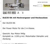 На самолет размахом 1800 и весом 4,9 -5,3 кг (А он у вас примерно будет столько весить с 35-м мотором) лучше всего поставить DA35. Поскольку вы живете в Германии, то купить его можно у того же Тони Кларка. Он официальный дилер этих моторов. Но если жаба душит, поскольку DA35 - мотор недешевый, то вам вполне будет достаточно DLE35RA. Он то же вполне нормально работает, но его стоимость прилично дешевле.