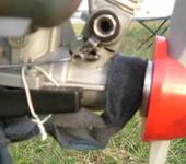 Двигатель занял свое прежнее положение (цилиндром вверх), а к карбюратору был изготовлен “воздуховод”… Для этого идеально подошла пластиковая трубка для электропроводки… Но пробный запуск двигателя с “воздуховодом” показал, что проблема решена не полностью - брызги все равно были и их “источником” оказался коленвал в месте выхода из коренного подшипника… Поскольку дело было в поле, то для попытки решения проблемы был использован кусок тряпки, завязанный вокруг “носика” двигателя в виде галстука… При всей своей примитивности, мера оказалась весьма эффективной - более полу-часа в воздухе и объектив чистый 😛…