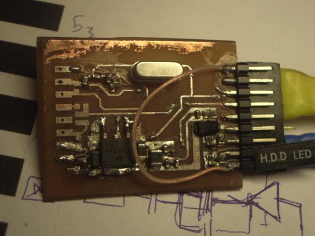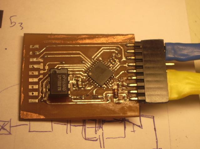 две недели опытов над фоторезистом + неделя на EAGLE 5.7.0 – сотворилось это чудовище(моя первая плата) atmega ,78М05 выдрана с убитого регулятора двигателя, остальные компоненты с раскуроченных CD-ROMов (с них я брал валы 3,0 мм для движков) прошил всё это через COM порт. Показались признаки жизни: