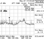 Да есть пик на 432 МГц, именно там стоит маркер. Кстати, все скрины в режиме тарссировки - отлова максиммумов в течении минуты. То есть мнговенные значения еще в несколько раз меньше.