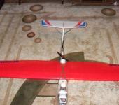 Вот таки доделал Скаю нормальное "серьезное"крыло, жалко мне на него смотреть когда у него крылья в дугу скручиваются! По этому поводу я вел полемику где то в темах,ну как и планировал по тому пути и пошел. Итак крыло: полностью бальсовое, обтянуто (Oracover) пленкой. Разборное на одной карбоновой(20см) вставке + направляющая втулка. Размах-1800мм. Хорда увеличена на 15мм штатного Скаевского. Увеличены Элероны. Излом крыла на 0.5 градуса меньше штатного. Сервы 9гр. Концевые нервюры под наклоном в 45 гр. относительно продольной оси крыла и поперечный скос как на штатном без зализов. Вес еще не мерял,но на глаз не намного,но легче "усиленного скотчем и трубами"штатного крыла. В общем жду погоду и буду тестить в визуальном полете. P.S. Профиль взял какой то NASAвский. Вычертил на миллиметровке 1:1, привык работать и собирать с “головы”.