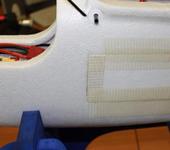 Дверца. Края обклеены армированным скотчем. Он же используется в качестве петли, им же дверца зафиксирована. Открываю только чтобы перепрошить автопилот. Обратите внимание на трубки для крепления крыла, чтобы материал не изнашивался вклеены пластиковые шайбы. Они предварительно деформированы для повторения контуров фюзеляжа и стоят утопленные вровень.