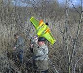 Сегодня чуть не потерял фанджета. Ветер был сильный ,но фанджет на моторе легко его прошивает, я поднялся по выше и тут отсекло, батарея кончалась. Самолет начало сносить ветром в сторону лесного массива. Однако FY20 продолжала удерживать самолет в горизонте. Благодаря ней повреждений самолета не было. Плюхнулся в где то в пересеченной местности: деревья, высокий кустарник глубокие лужи воды. В 5 метрах почти ничего не видно. Пробовали найти самолет по последнему вектору, но ничего не получилось. Вернулся к машине за рацией, в самолете установлен маячок от Петра (fmkit). Маячок слышно нормально, но навыков взятия пеленга у меня нет, да и рация у меня с откидной антенной. Сложил антенну и попробовал определить направление, но как только не пробовал и закрывал собой рацию и полукруглым куском металла, но точно направление определить не получалось. В конце – концов, сделал проще шел по прямой и старался определить, где мощность сигнала больше, затем в точке с максимальной мощностью делала еще один проход перпендикулярный первому. Хорошо, что маячок выдает несколько сигналов с разной мощностью. Вот по сигналу с минимальной мощности и индикатору на радиостанции удалось локализовать участок, в середине которого и лежал самолет.