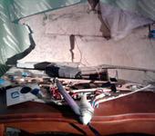 Потом вспомнил как падал, вспомнил что валился на крыло, а значит катился кубарем. Стал осматривать ближайшие заросли травы и после недолгих поисков нашел кабинку, оторванные куски элапора, камера осталась висеть на проводах и не потерялась (МГТФ рулит).
