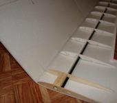 Я разборное крыло делал так: купил в магазине две алюминиевые трубки от каркаса палатки, они уже с соединительной трубочкой внутри. Трубки обрезал так, чтоб внутрь крыла они входили по 20 см. К трубкам на циакрине приклеены сосновые лонжероны, швы залиты термоклеем и замотаны капроновыми нитками. На конце крыла лонжероны сходятся вместе, и от алюминиевой трубки до места соединения вклеена пенопластовая вставка.