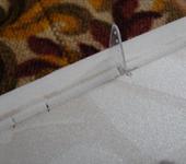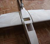 Удачно у меня получился и узел фиксации крыльев. Трубка из левого крыла проходит сквозь фюзеляж и входит в правое крыло. И в том месте где одна трубка находится в другой просверлено отверстие диаметром 1 мм прямо через обшивку и обе трубки. В отверстие после сборки вставляю согнутый гвоздик и заклеиваю кусочком скотча чтоб не выпал.