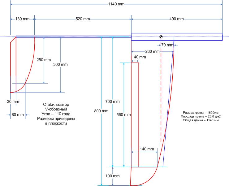 От сюда взял габариты и хорду, предварительно удлинив хвостовую балку до 700мм