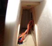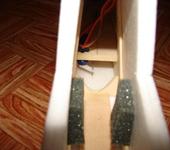 по низу фузеляжа проходят два лонжерона из линеек, в передней части (горизонтально) вклеена под наклоном еще одна линейка для “отстрела” аккумулятора в правильном направлении. Центроплан на болтах прикручивается к верхней части фюзеляжа (там тоже усилено линейкой) на ней-же крепится моторама. Люк с боку для облегчения доступа к потрохам (приемник Turnigy 9x, Eagletree OSD pro ну и контролер движка). В нижней части фюзеляжа впереди и сзади предусмотрены две усиленные площадки для шасси.