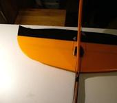 Ещё здрасте типа… Быстренько обмерил изделие. Чертежей как таковых не имееться, потому как строилось по эскизам и фотографиям вышеозначенных прототипов. Изначально основой взят Гринин Икар, а пропорции по фоткам некий симбиоз “изискай и т.д.” Крылушко конечно не Гринина технология и профиль явно толще. Но что думал, то и строил. Угол установки крыла относительно стаба 2 - 2.5 градуса. Ось мотора наклон вперёд на 3 примерно градуса. Теоретически Ц.Т. 110 мм от передней кромки…на практике 30% хорды в корне и задневато…вот так.