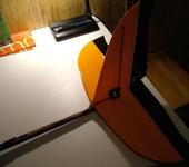 Ещё здрасте типа… Быстренько обмерил изделие. Чертежей как таковых не имееться, потому как строилось по эскизам и фотографиям вышеозначенных прототипов. Изначально основой взят Гринин Икар, а пропорции по фоткам некий симбиоз “изискай и т.д.” Крылушко конечно не Гринина технология и профиль явно толще. Но что думал, то и строил. Угол установки крыла относительно стаба 2 - 2.5 градуса. Ось мотора наклон вперёд на 3 примерно градуса. Теоретически Ц.Т. 110 мм от передней кромки…на практике 30% хорды в корне и задневато…вот так.