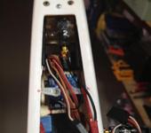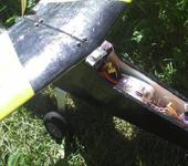 В верней части разъемами вверх установлен 8 канальный футабий приемник, вместо штатных усов антенны с кинга. Под приемником АКБ 800 мА. Надо немного переделать фанеру чтобы была возможность извлекать его. В глубине хвостовой балки на 0,5 мм полоске стеклотекстолита прикручен передатчик с клевером к фанерке. Т.е. излекая фанерку вытягиваем передатчик.