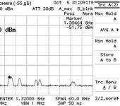 ПСы спектро анализаторов нет, но самодельный эквивалент нагрузки, из одноватного резистора на выходе Тини, греется соответствующе, току при моще около 1 вата. Да и лампочко тестер показывает примерно одинаковые результаты с полной версией на моще для 1 вата.