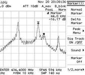 Более точно измерил собственные гармоники передатчика (при работе на чисто активную 50 Ом нагрузку). Вторая гармоника - 31.6 дБ, третья - 48.5 дБ, четвертая - 58 дБ. Более старшие гармоники на моем анализаторе не видны (его диапазон измерения гармоник 70 дБ).