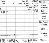 Передатчик зглушенный аттенюатором 50 дБ, без антенны, помещался в микроволновку. Минимальный различимый на анализаторе сигнал составлял - 89.5 дБм.
