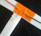 Проводки самой лампочки идут параллельно друг-другу почти на всю длину. (ровно и между ними маленькое расстояние). Хвостики от лампочки загнул по 2мм (около). к ним подпаял провод от удлинителя серв. Расстояие от центра между параллельными проводками по 165мм. (честно говоря расстояние от балды ±2мм - линейка деревянная и кусачки кривые) Скотч и Т-образная рама из потолочной плитки.