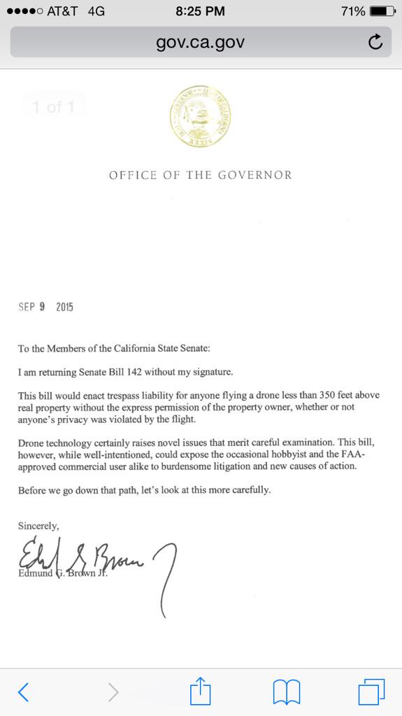 Какой-то один представитель сената штата Калифорния решил не голосовать за некий законопроект ограничивающий права моделистов?