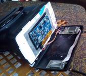 Еще была мысль запитать все от одной банки через step-up 5в. В принципе получилось , но ток с батареи был 1,5 А. Думаю батарея с ipod 2200 которая туда прекрасно стает , не выдержит.