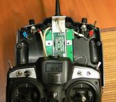 По схеме, почти копия тины, питание бек 5.5 модернизированый dc-dc kis-3r33s , мега на 3.3в сидит. Все затолкано в пульт flysky9x (аналог турнижи). Плата прижата к алюминиевой пластине которая служит радиатором, креплением и противовесом антенны. Провода от регуляторов и переключателей заменены на экранированные, из за близкого расположения к ВЧ элементам.