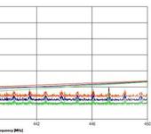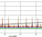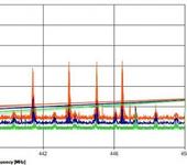 На второй - скан работающего передатчика Тину, вверху без фильтра, внизу с фильтром. Видно как обрезаны помехи и крайние частоты. Если проводить границе полосы пропускания по уровню -3 дБ, то не давятся частоты 439.5-445 МГц, если брать по -6 дБ, то диапазон пропускания 437-446 МГц. Подавление на границах диапазона: 433 МГц -30 дБ, 447 - 15 дБ. За границами - от -30 до -50 дБ. Ослабление в полосе пропускания - порядка 3 дБ.