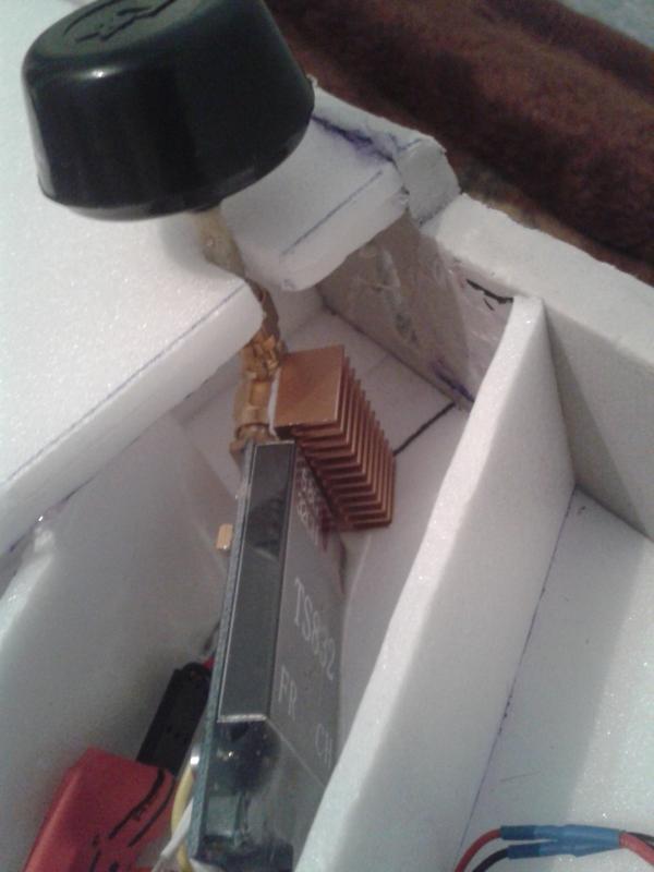 А почитать тему не пытались? Фотография передатчика см. топик №6482. Вопрос задан топик№6538. Ответ топик№6545. То, что вам попалось на глаза, это решение для передатчиков на частоту 1,2ГГц. Что вы сколхозили, действительно, так делать нет смысла. Засунули всё в пенопласт. Он является хорошим теплоизолятором, охлаждаете разъём, а не ИМС, нет притока воздуха.