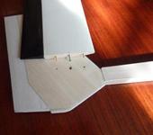 2.В крыло, в местах крепления хвостовых балок вклеены двойные силовые нервюры, через которые проходят винты крепления балки, по два винта на каждую балку. Очень простая конструкция т.к. профиль крыла ClarkY с плоской нижней поверхностью. При аварии винты должны вырываться из крепления. Они, по идее, должны держать слабее чем выдерживает само крыло и хв. балки.