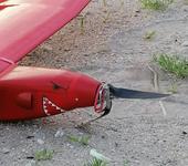 Сегодня к вечеру ветер стих, поехал подлетнуть на заброшенную полосу. Самалет конечно хороший, но любит скорость. На 4х банках с винтом 8х7 хочет лететь 90км/ч на 50% газа, но на посадке из за скорости хочет скошенную полосу. Я пока занимался квадриком потерял навык управления и на посадке немного оторвал “морду” лица, обтекатель с камерой повис на проводах. Прикрутил скотчем и полетел дальше. Выезжал проверить переделанную наземку, теперь без штатива просто ставлю на крышу машины.