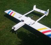 Самолет (чуть как планер) с толкающим винтом, размах 170см. крылья прямые (или стреловидность по передней кромке всего 5`). Весом ~1500гр. Комфортно летает для FPV на скорости 30-40 км/ч. и имеет максимальную скорость при этом 80 км/ч.