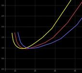 Вот иллюстрация в XFLR5. Это полное сопротивление в зависимости от скорости. Профили 10%, 9% и 8%. Размах 2000, 1800, 1600. При этом полетный вес одинаковый