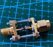 Экспериментировал вчера с полосовыми фильтрами, получил очень странные результаты. За неимением печатки собрал по-быстрому вот такую конструкцию из двух разъемов SMA, между центральными проводниками которых и запаял фильтр.