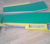 Центроплан перед склейкой разрезан пополам. Вдоль основного лонжерона доклеил еще один на ~2/3 длины центроплана, так что между ним и основным была щель толщиной с линейку. Этот дополнительный лонжерон усилен косынками (основной и так трехслойный, крепкий). На верхней и нижней обшивке с внутренней стороны приклеены кусочки тонкого пластика (стаканчик экспресс-лапши) в местах где будущая соединительная линейка входит в центроплан и где оканчивается, дабы она не проткнула обшивку. Ближе к задней кромки центроплана подобная конструкция, только короче и менее усилена, в принципе только для удобства сборки. Соединительные линейки видно на фото. Прочности для полета точно достаточно, ну а что будет при аварии - жизнь покажет, надеюсь “резиновое” крепление спасет…