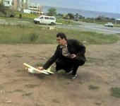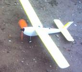 Разбег - метров 5, затем спокойно и уверенно полез вверх. Скинул газ, примерно до трети, оттриммировал (немного вправо и вверх), и спокойно, слегка покачиваясь при порывах ветра, сделал несколько кругов. На посадку шел с выключенным двигателем - планирует - просто сказка. Метров с 15 сделал 2 круга над пустырем, радиусом метров в 30, спокойно выбрал посадочный курс, и сел на тропинку. В общем, получился устойчивый, предсказуемый самолет, по крайней мере в ровном полете. Вечером, будет больше времени, посмотрим на какие фигуры он способен.