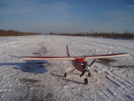 Для ДВС полетной массой от 1 Кг (т.е. под двигло от 2.5мл и выше) обычно требуется участок земли не менее 250х250 метров, а для учебных полетов и все 400х400, и кусок ровной дороги длиною не менее 100 метров и шириной от 6 до 15 метров. Конечно, можно запускать ДВС-ку без шасси, кидая ее с рук и сажая затем на брюхо в траву или снег - но для такого запуска крайне желателен помощник.
