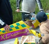 Выхожу в поле, уже достаточно спокоен, проверяю центровку, двигаю элеронами, проверяю реверс РВ – все нормально. Даю газ, бросаю, и млею от восторга – вот это тянет!!!. Легкий крен, начинаю парировать, крен резко увеличивается, пара неуправляемых петель – результат земля. Все происходит быстро, но газ убрать успеваю. Легкий полевой ремонт, все повторяется, результат такой же, моторама в утиль. Складываю самолет, дома забрасываю его на далекую полку, понимая, что это не моё. При просмотре видео неудачных запусков вижу, как сильно реагирует самолет на движения РВ. Понимаю, что выставил со страху большие расходы. Воспрял духом. Через неделю достаю, ремонтирую. Поскольку аппаратура простенькая, регулирую плечами качалок. Зажимаю до минимума. Иду в поле с идиотским оптимизмом. Проверяю центровку, двигаю элеронами, проверяю реверс РВ и РН – все нормально. Газ, бросок, летит, легкий крен, парирую, крен увеличивается, но не так резко, как в предыдущие разы, что-то щелкает в мозгу – даю ручку в обратную сторону – крен выравнивается, понимаю, что РЕВЕРС на элероны, долболюб, не проверял начиная с месса!!! Автоматом включаю реверс в мозгу или что его там у меня заменяет, делаю коробочку на высоте 10-12 метров, завожу против ветра, плавно снижается, плавно убираю газ, высота уже полметра, скорость еще высоковата, убираю газ еще больше, двигатель останавливается, модель быстро теряет скорость, валится на крыло, вырывает с мясом крыло, из крыла серву, теряются тяги. В полетном ящике полхозмага, а тяг нету. Иду домой, ремонтирую, дожидаюсь тихой погоды, едем на старый аэродром. Предполетная подготовка, проверка центровки, реверса всех рулевых плоскостей, к полету готов. Совсем небольшой мандраж, газ, бросок, летит, управляется! Правда по крену хреновенько, чувствуются зажатые расходы, при ветре 3-6 м/с управлять трудновато. Делаю коробочку, сажусь. Увеличиваю расходы, опять в небо. Минуты через полторы полетов, понимаю, что можно летать в полгаза, двигатель с запасом. Ух ты! Как он уже далеко! Разворачиваю, летим назад, начинаю водить по коробочке, минут пять так летаю, устаю, всё-таки первый управляемый полет, выполняю разворот на посадку метрах в пятидесяти, сбрасываю газ, планирую, легкое касание – посадка! Даже пропсейвер не пригодился. Отдышался, хлопнул победного коньяка, и начал летать. Расхрабрился, затянул повыше, открутил все, что можно на самолете с большим V и без РН. Вобщем пока выкатал акк, совершил еще три штатных посадки. Ну а дальше пошло-поехало, тренер изучил наизусть. Затем руки дошли до месса, но день запуска месса на заливном лугу совпал с каким-то ежегодным профсоюзным слетом насекомых, аналогом гнуса, тысячи их, которые запилили меня с женой в считанные секунды. Будете смеяться, но в результате сборки под непрерывными атаками кровососущих тварей был благополучно попутан реверс РВ, и не менее благополучно просмотрен при проверке, поскольку жалили сильно, быстрее-быстрее надо было. В итоге морковь и постоянное бормотание на обратном пути жены в спину совершенно справедливых фраз «лох-это судьба» и «бугога». По окончании слета кровососов и перепроверки реверсов, уже без особых душевных метаний был запущен в первый самостоятельный полет мессершмит, он оказался немножко посложнее в управлении, но каких-либо нештатных ситуаций не возникало.