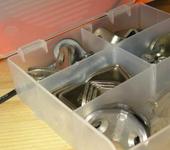 По кабанчикам. Валялось дома несколько баночек для всяких мелочей(типа кассетниц) купленых как то ну совершенно за смешные деньги в реале(не помню точно, кажется самая маленькая баночка - 11руб, они там разные были), Капрон, толщина порядка 0,8-1 мм. В самой маленькой(она и была пущена на заклание) внутри 2 перегородки. Выпилил этот Т-образный профиль ножовкой, сделал заготовки по ширине кабанчика( на птенца- 7 мм,вернее на 2-3мм пошире, что б кабанчик был “правильный” - и выступал за пределы крепежной площадки)))получилось шт 10-12. Обрезки стенок - пошли на обратную-ответную площадку кабанчика(та, что для крепления). Примерно нацарапал нужный профиль, далее просто нож+плоскогубцы-длинногубцы (по ним удобно ножом строгать -наложил, состругал) состругиваю неспеша, отверстия просто прожег скрепкой разогретой на зажигалке.