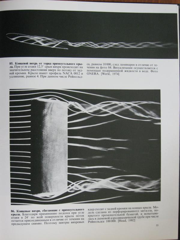 Приводимые фотографии относятся к разным экспериментам: во время второго, производился отсос пограничного слоя и поэтому зона возникновения концевого вихря сдвинута к задней кромке. На верхнем фото, показано естественное обтекание и видно, что концевой вихрь охватывает почти все концевое сечение.