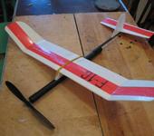 Ещё наши наработки: резиномоторная модель самолёта : фюзеляж из 2 слоёв ватмана, крыло и хвостовое оперение из потолочки. Крыло имеет вогнуто выпуклый профиль и усилено рейкой. Хвостовая балка из бальзовой рейки. Масса 70 г, 10 г резиномотор. Размах около 70 см, длина 65 см. Лопасти винта из липовых пластинок. Модель рассчитана для начинающих, её параметры укладываются в класс F-1G.