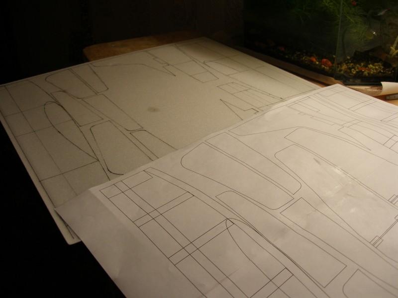 Я обрезаю бумагу рядом с контуром будущей детали, и кусочками скоча клею к потолочке. Потом острым ножом режу потолочку через бумагу по линиям деталей. Получается наиболее ровно.