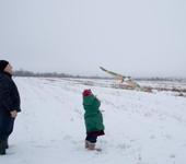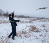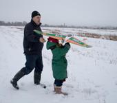 Сегодня с короткого, метров 40, леера позапускали. Погода идеальная, ветер до 3 метров в секунду, температура около -5 (даже перчатки не одевал), снег еще не очень глубокий. Управляли по очереди. Были и мягкие посадки у ног, и втыкание в землю под 45 градусов со спины, и цепляние крылом за землю. Но пенопласт со скотчем и отстегивающиеся крыло все терпит. Снег хоть и не глубокий, но тоже смягчает удары.
