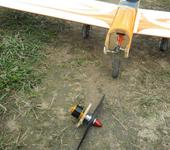 Крыло как и предсказывали – легко отделилось и метров за 7 улетело в сторону. Из него вырвало руль машинку и я её ещё долго искал. Ну, в общем, и всё. Двигун со шпангоутом неглубоко в землю зашёл, передняя стойка свой шпангоут выворотила, крышка батарейного отсека в труху. Вот и всё. Даже винт целый.