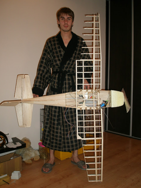 самолет весит около 1,9 кг с бортовой батареей + бак + все сервы и передатчик. так что взлетный вес ожидаю около 4, может 4 с небольшим кг.