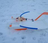 С начало сделал её из потолочки в два слоя, поплавки из рыжего пенопласта, установил похожий на рекомендуемый двигатель и аккумулятор три банки 1250ма. Но мне показалось, что она получилась очень тяжелой для такой площади крыла, к этому моменту я её почти разбил, так и не научившись на ней нормально летать, хотя по снегу гоняла отменно, тяги явно с избытком. Даже обклеенная скотчем потолочка показалась мне очень хрупкой на морозе, поплавки постоянно выламывало на поворотах, а при не больших падениях лопалась потолочка, мне надоело её заклеивать и я решил сделать её из Э.П.П.
