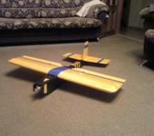 С вашего разрешения AVIS, хочется показать мой первый самолет, мою “учебную парту”. Размах 135 см, вес 1050, мотор 400 ватт, управление элероны и руль высоты. В отсутствии опыта и бальзы использовал материал пеноплекс, по низу усиление, облегченная фанера.