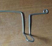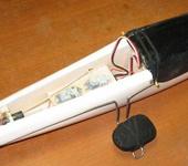 Его закрепить, исходя из требований, не просто. Я сейчас придумал хитрое приспособление из толстой проволоки, которое цепляется сбоку фюзеляжа как раз на штыри крепления крыла. Но вес… Пришлось делать из стальной проволоки за неимением алюминия (за неимением горничной имеют дворника 😃).